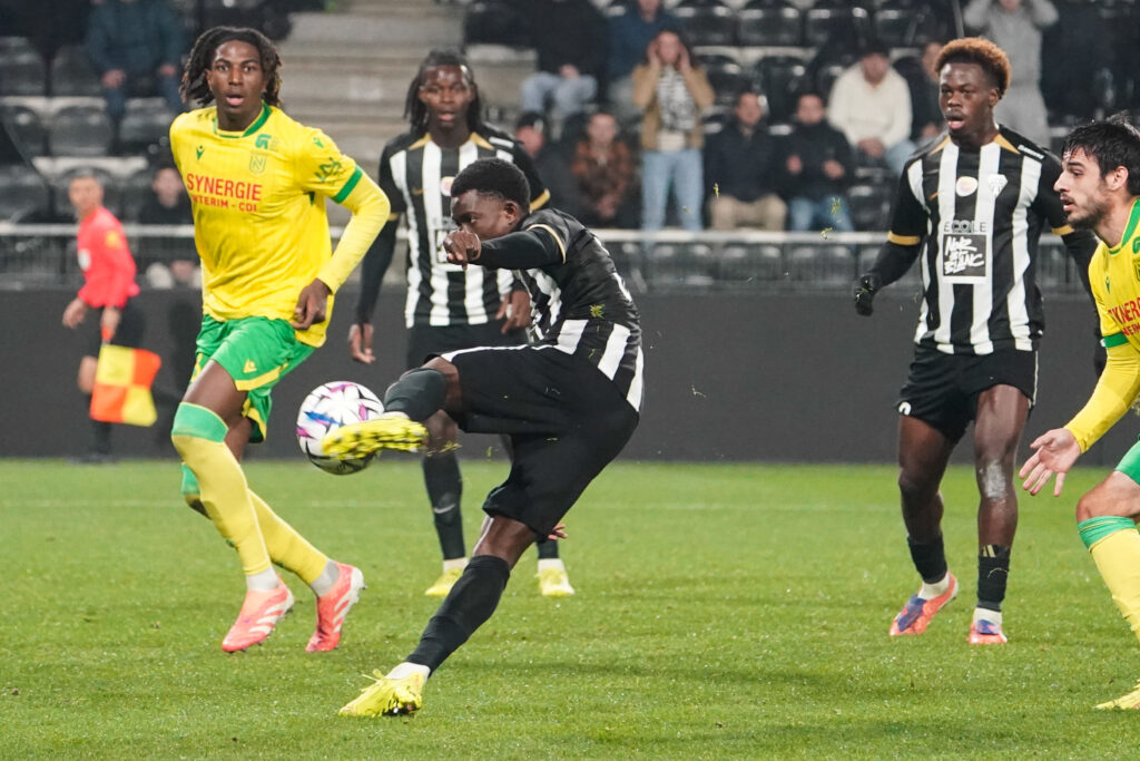 La rencontre démarre sur les chapeaux de roue. Les Noir&Blanc appliquent une pression constante sur les Nantais et récupèrent des ballons haut. Louis Mouton subtilise l’un d’eux et tente sa chance de manière instinctive avec une frappe qui passe de peu au-dessus (8′). Alors que la pression continue d’être instaurée, un nouveau ballon dans la surface nantaise est touché de la main par un défenseur. Après analyse vidéo, c’est un pénalty qui est accordé ! Himad Abdelli ne se fait pas prier pour le transformer (1-0, 17′). Quelques minutes plus tard, Hervé Koffi réalise un bel arrêt pour empêcher Nantes de réagir rapidement (26′).