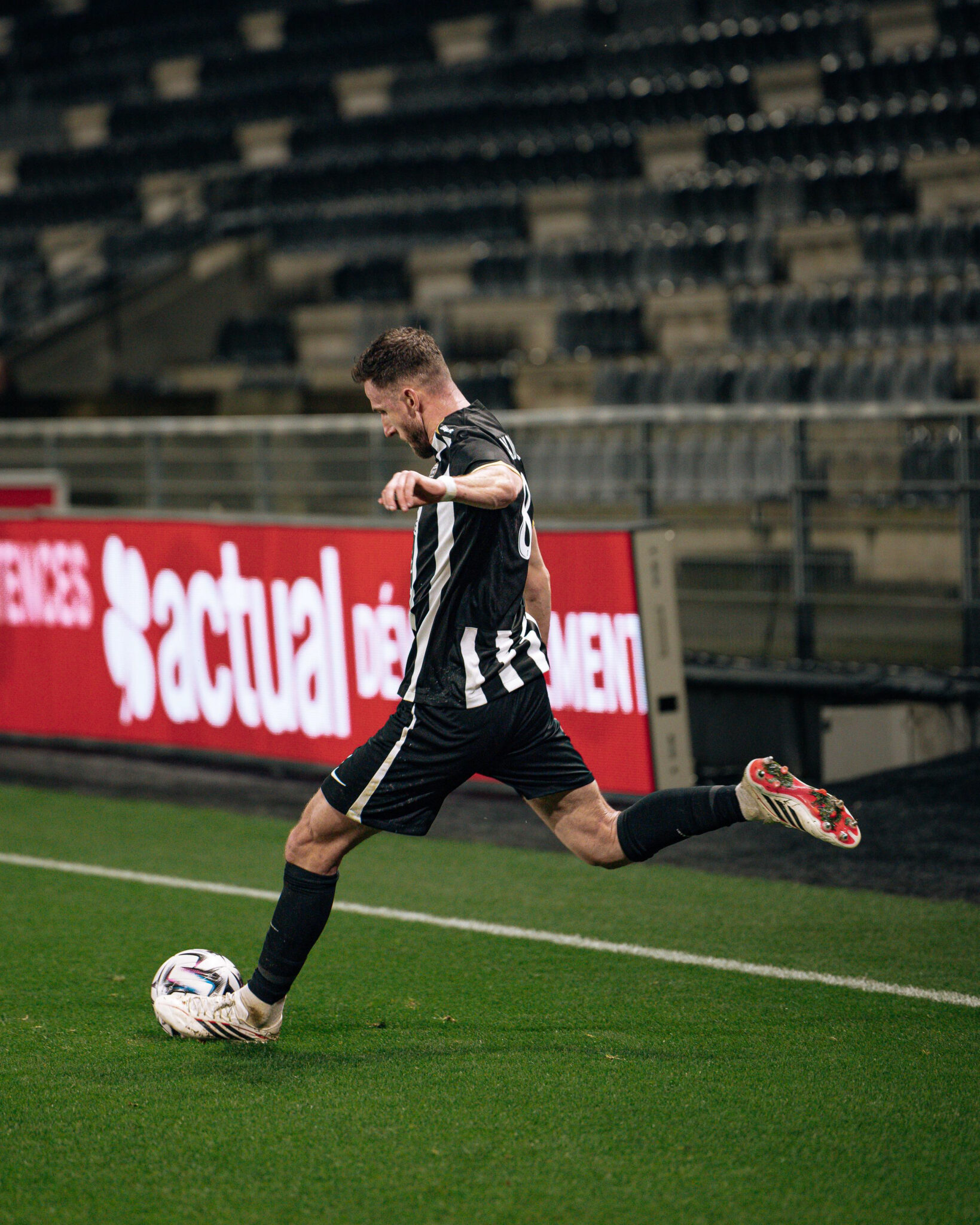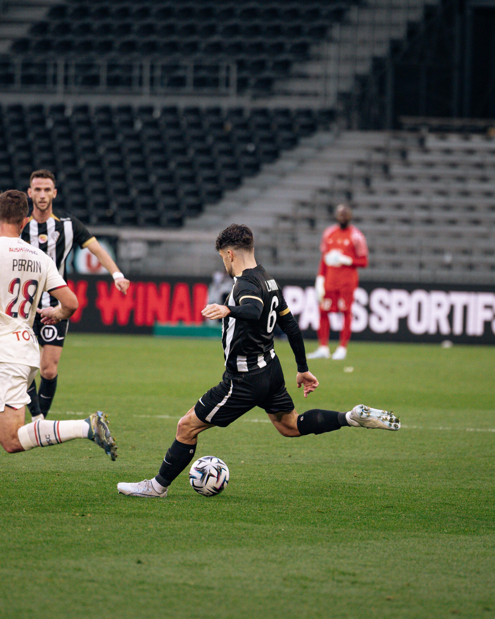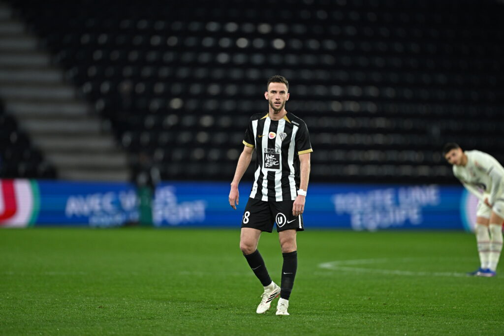La demi-heure de jeu passée, et après avoir subi plusieurs assauts adverses consécutifs, nos Noir&Blanc accélèrent et se procurent quelques situations. Branco van den Boomen trouve Goduine Koyalipou sur coup franc mais la tête de ce dernier passe à côté. Trois minutes plus tard, Amine Sbaï effectue un bon travail pour remonter le terrain et servir Louis Mouton en entrée de surface. La frappe de notre numéro 6 manque de peu le cadre. Dans les ultimes instants de la première mi-temps, Olivier Giroud convertit un pénalty et permet aux visiteurs de mener (1-0, 45+1’).