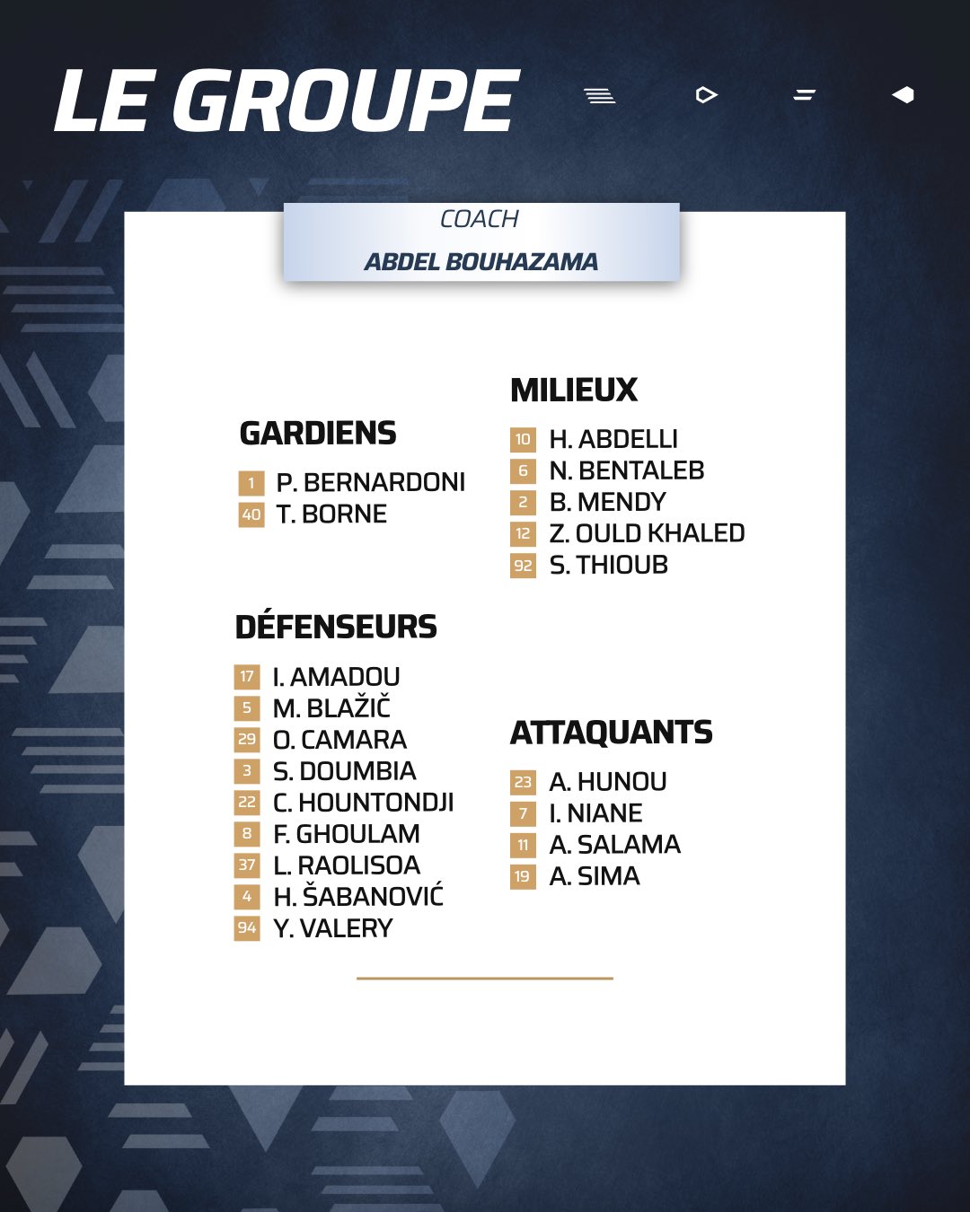 Pour cette 21e journée de Ligue 1 Uber Eats, les Scoïstes reçoivent l’AC Ajaccio à 19h. Découvrez le groupe retenu pour cette importante rencontre.
