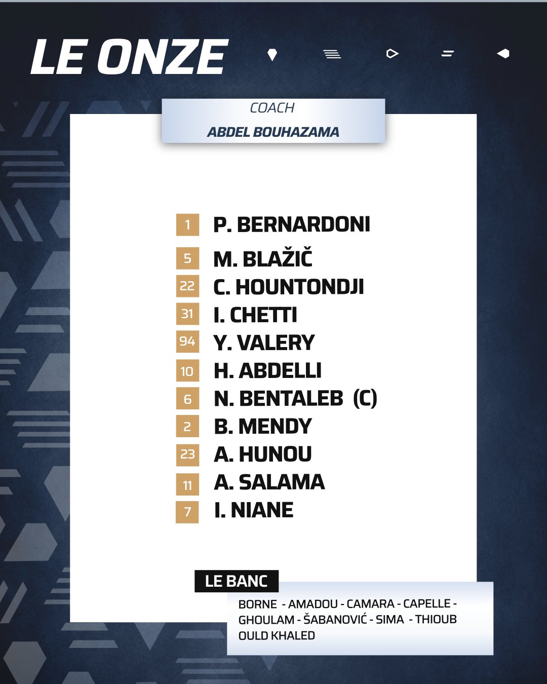 À noter la première titularisation d’Ibrahima Niane et le retour d’Ilyes Chetti.