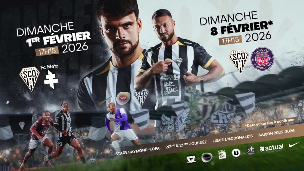 Après un déplacement ce dimanche sur la pelouse du Paris FC, Angers SCO entamera le mois de février par deux matchs consécutifs à Raymond-Kopa : la réception du FC Metz le dimanche 1er février, puis celle de Toulouse le dimanche 8 février.