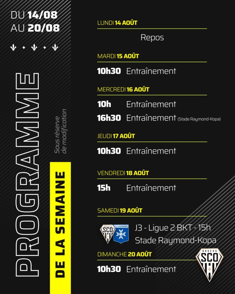 Découvrez le programme de la semaine d’entraînement des hommes d’Alexandre Dujeux avec la réception de l’AJ Auxerre, samedi 14 août 2023, à 15h.